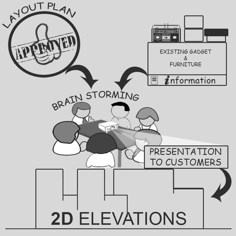 Detailed information regarding existing furniture and electrical appliances/gadgets are prerequisites to kick-start the phase. We brainstorm and come-up with design concepts, themes and 2D elevations. The same is presented and will require your approval to move to the next phase.