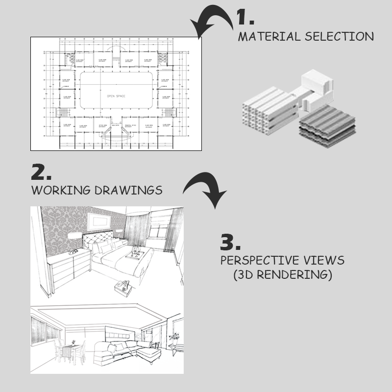 On the basis of approved Layout plan & 2D elevations we meet for material sampling. This helps us in creating Technical Drawings and 3D perspective views.