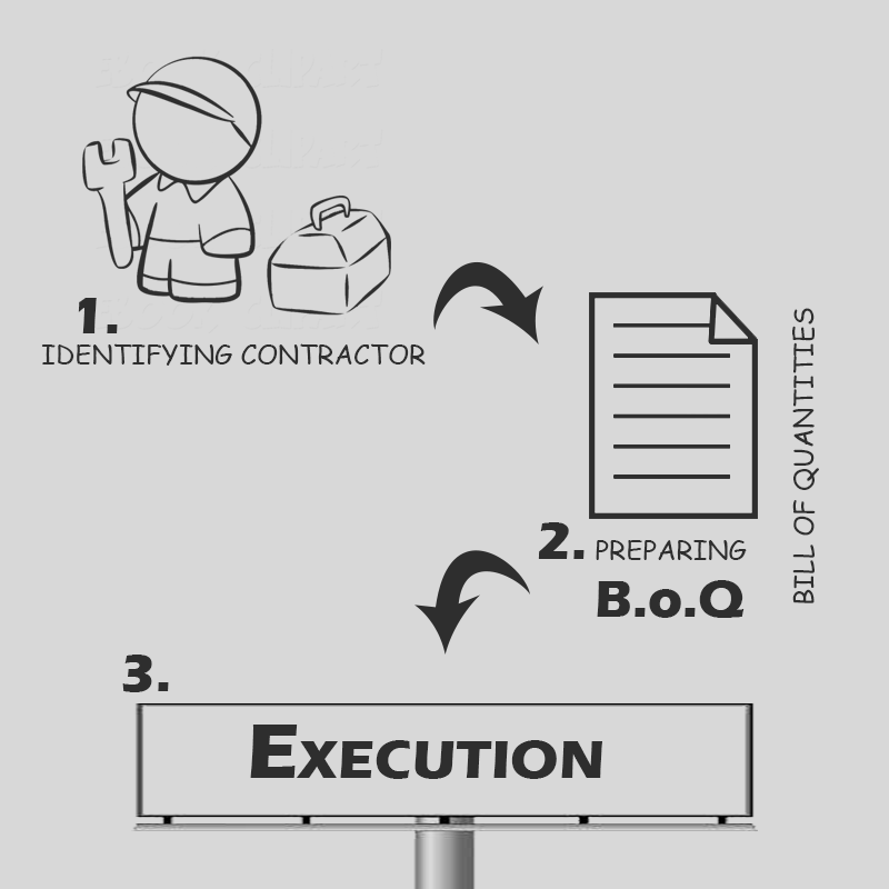 Once Technical Drawings and 3D perspectives are ready, we go ahead to identify the right contractors for your project (at this time you can also suggest a contractor of your choice) and create BoQ (Bill of Quantities). After this the stage is all set to start execution work on your project.